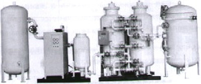 制氮机主要由两个填满碳分子筛的吸附塔组成,当洁净的压缩空气进入吸附塔时,由于其中的O2在碳分子筛内扩散速率较快,使N2在气相中得到富集;另一塔已完成吸附的碳分子筛则被减压解吸,然后用N2吹扫再生,使其恢复原有吸附能力,两塔交替循环,即可得到纯度为99%-99.9%的廉价氮气。再经本公司生产的氮气净化装置除去其中微量的O2,H2O等杂质,N2纯度可达99.999%以上。